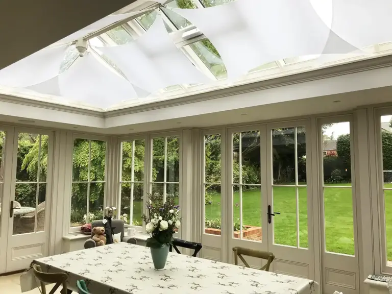 Based near Olney in North Buckinghamshire, we design and install bespoke sail blinds for conservatories, orangeries and roof lanterns across Buckinghamshire, Bedfordshire and Northamptonshire. Roof sails offer a modern alternative to traditional roof blinds, helping control heat and glare while still allowing natural light to filter through.